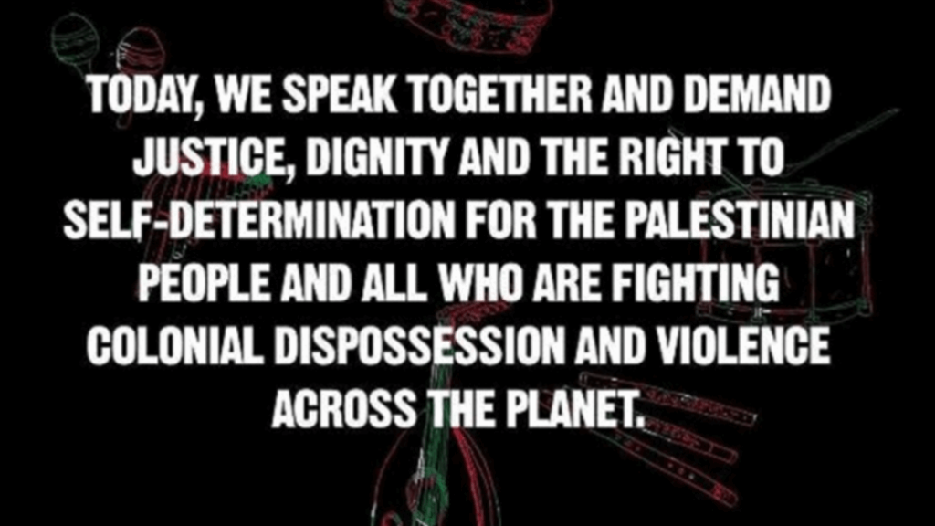 وقع قرابة 600 موسيقي على خطاب مفتوح دعوا فيه فنانين آخرين للانضمام إليهم في مقاطعة إسرائيل والتضامن مع فلسطين. وقال الموسيقيون في رسالتهم: “نحن كموسيقيين لا يمكن أن نبقى صامتين ومن الضروري في هذا الوقت أن نقف مع فلسطين.. نحن ندعو أقراننا للتأكيد…