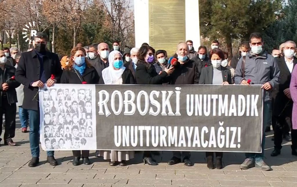 Diyarbakır (Rûdaw) – Diyarbakır’da düzenlenen Roboski anmasında konuşan Maden Mühendisleri Odası Eşbaşkanı Doğan Hatun, “34 insanın 19’u çocuktu. Cenazeleri katır sırtında taşındı. Bombaladıklarında uçaklar vardı da, cenazeleri kaldırıldığında…